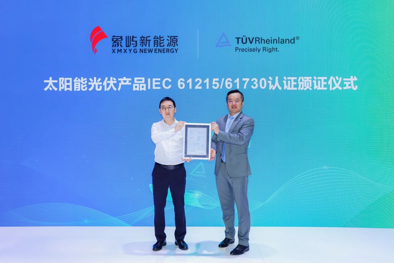 2025年6月11日,在第十八届(2025)国际太阳能光伏与智慧能源(上海)大会暨展览会现场,厦门象屿新能源有限责任公司(以下简称“象屿新能源”)荣获德国莱茵TÜV集团(简称“TÜV莱茵”)颁发的IEC 61215:2021及IEC 61730:2023认证证书。象屿新能源总经理助理郑敏敏、TÜV莱茵大中华区太阳能与商业产品服务副总经理张海洲出席颁证仪式,标志着双方在光伏组件质量验证、技术创新及国际市场拓展等领域展开更深层次的协同合作。