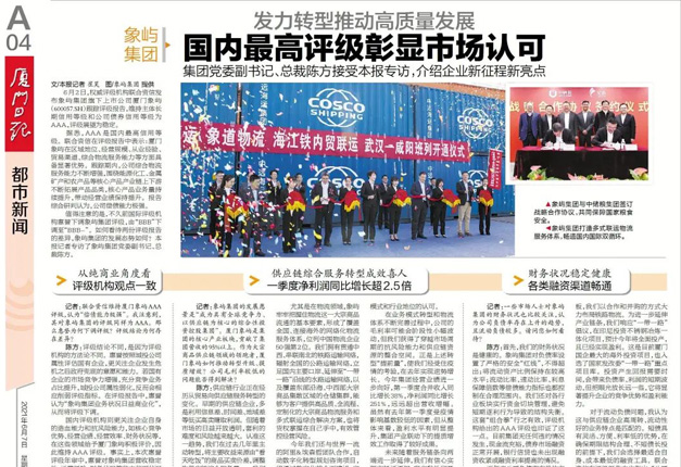 厦门日报 | 象屿集团发力转型推动高质量发展,国内最高评级彰显市场认可