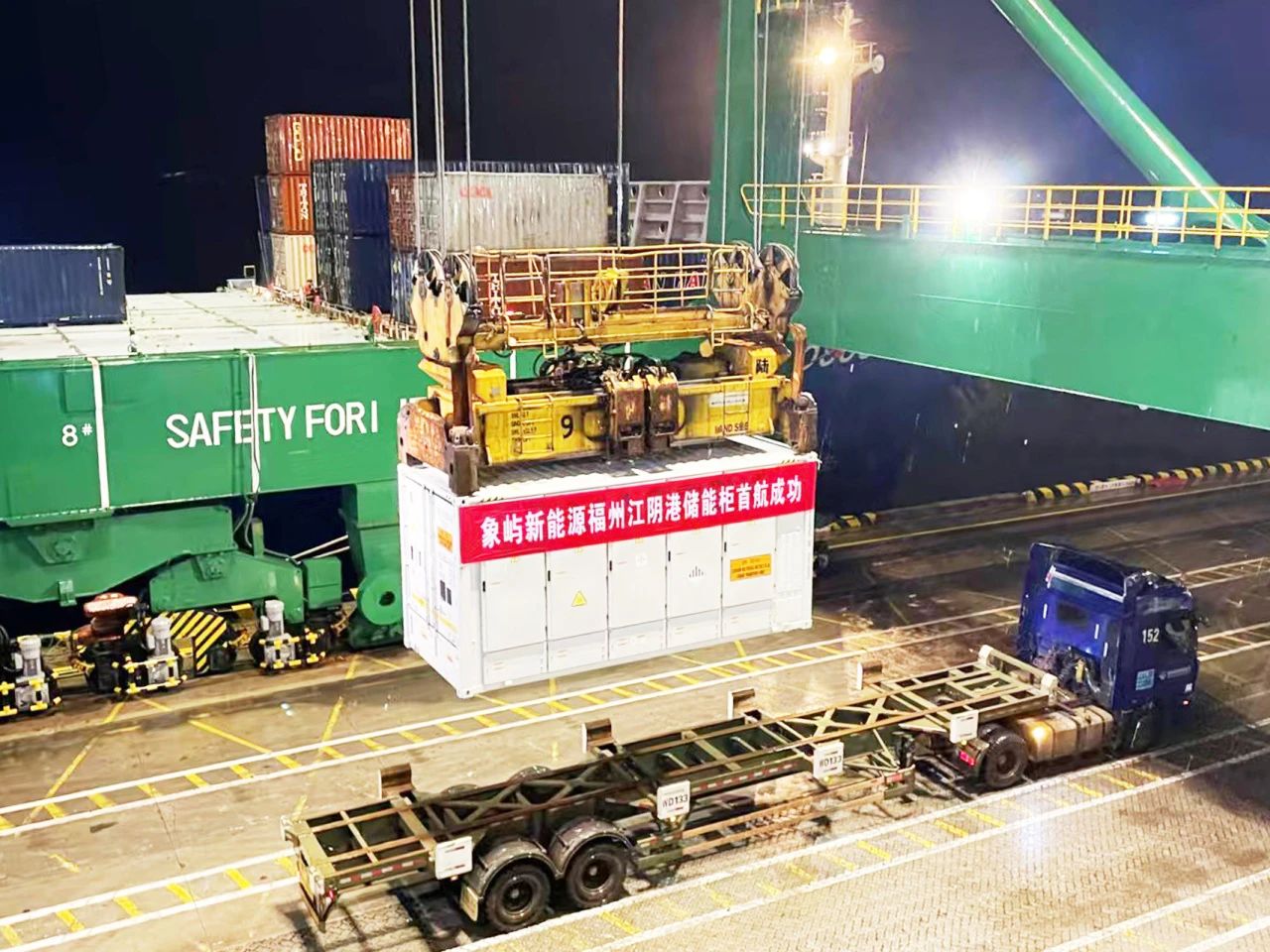 5月28日晚,福州江阴港码头灯火通明,由厦门象屿新能源有限责任公司(以下简称象屿新能源)承运的首批构网型液冷储能柜在此顺利完成装船作业,启程驶向巴基斯坦卡拉奇港。这批总容量达20.7MW/22.7MWh的储能装备,将落地巴基斯坦最大水泥制造企业,用于打造当地目前规模最大的构网型液冷工商业储能项目,为企业可再生能源的稳定消纳与高效利用提供核心保障。