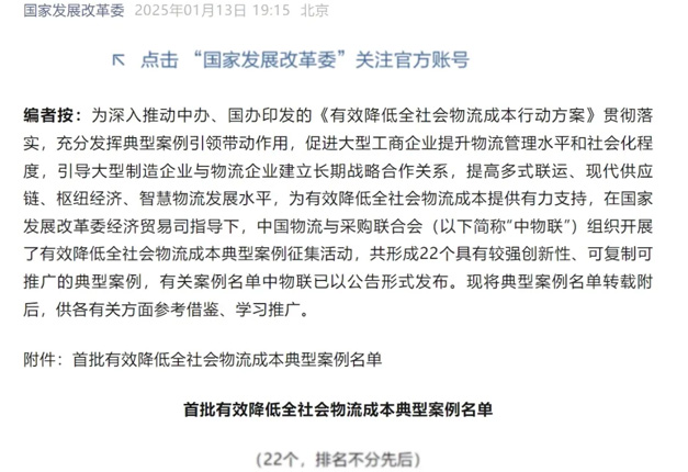 中央经济工作会议提出实施降低全社会物流成本专项行动。近日,在国家发展改革委经济贸易司指导下,中国物流与采购联合会发布首批有效降低全社会物流成本典型案例。